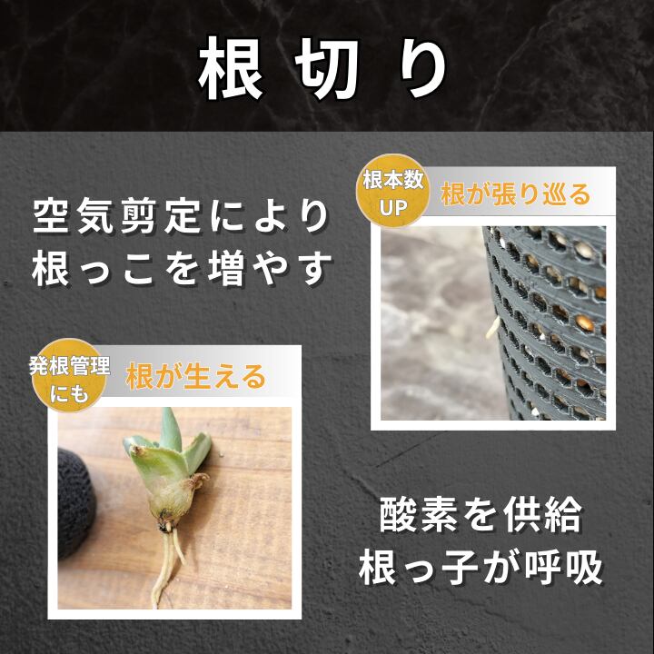 根の船頭は空気と光を嫌うため、メッシュに到達した根は一時停止し、新しい根を生やそうとします。その特性を生かし、根回し(サークリング)を抑制しつつも、根っこの量を増やす仕様を目指しました。