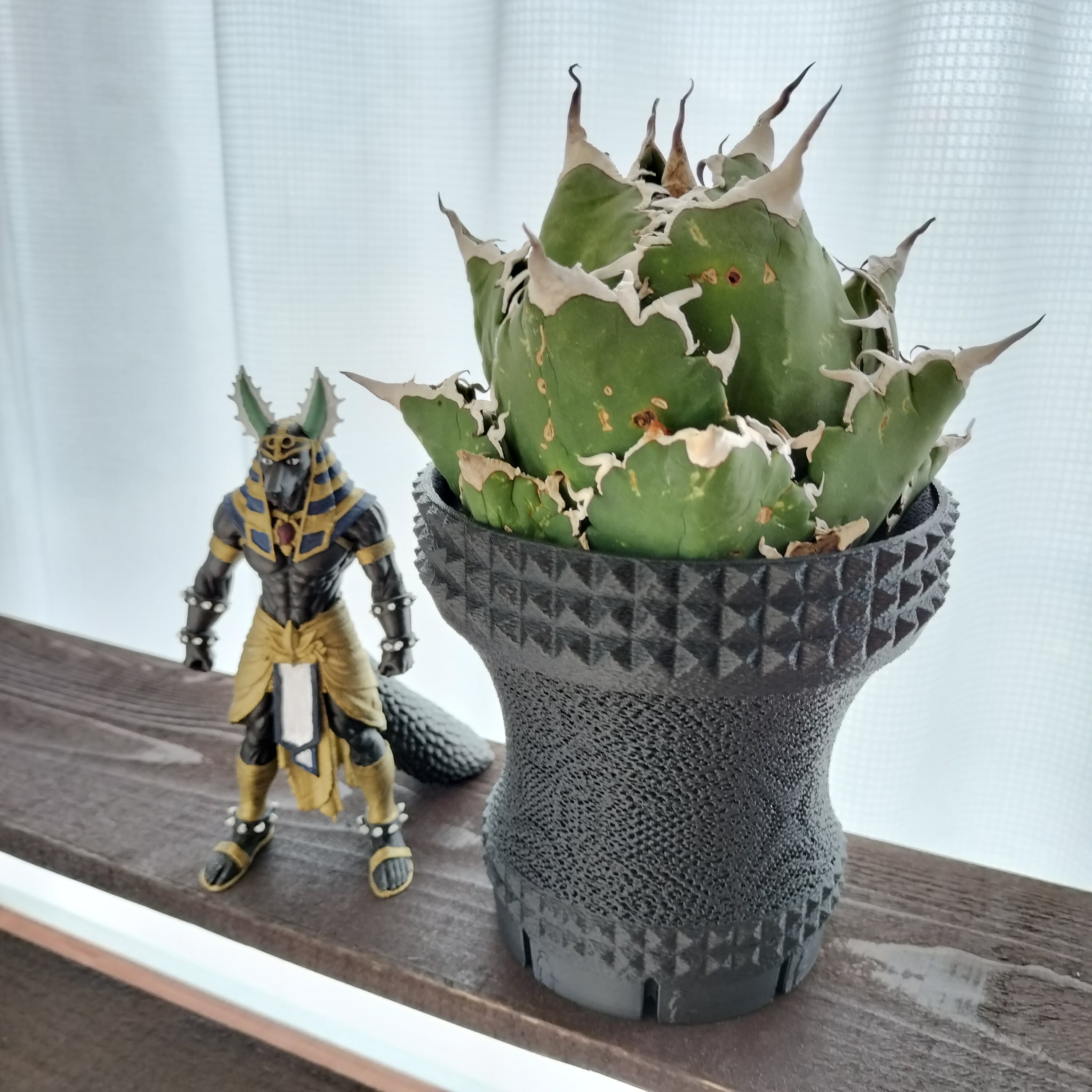「AGI043 鋸葉のアヌビス」が身に着けている腕輪から着想を得て、アガベ専用鉢を創作しました。穴が細いので腕を通して遊ばないように! なお、アヌビスやアガベは付属しません。